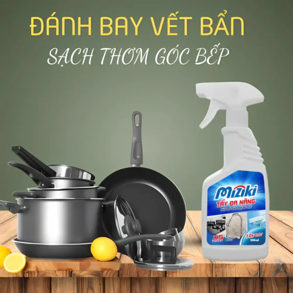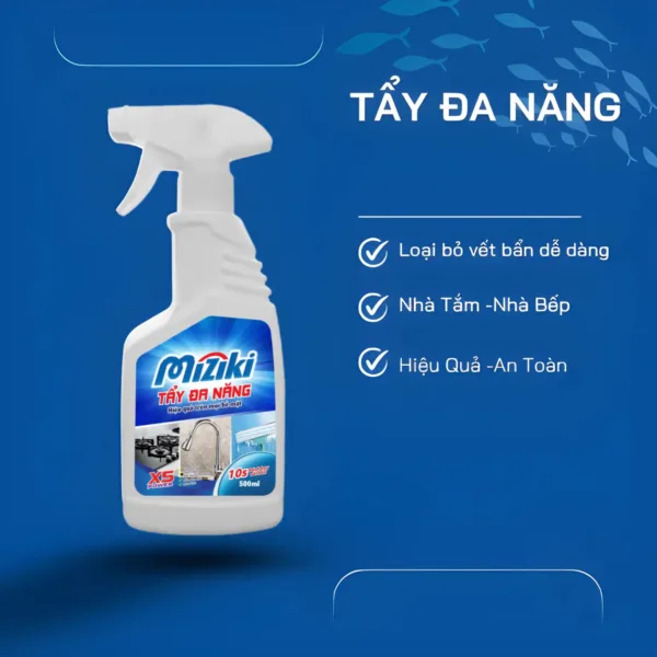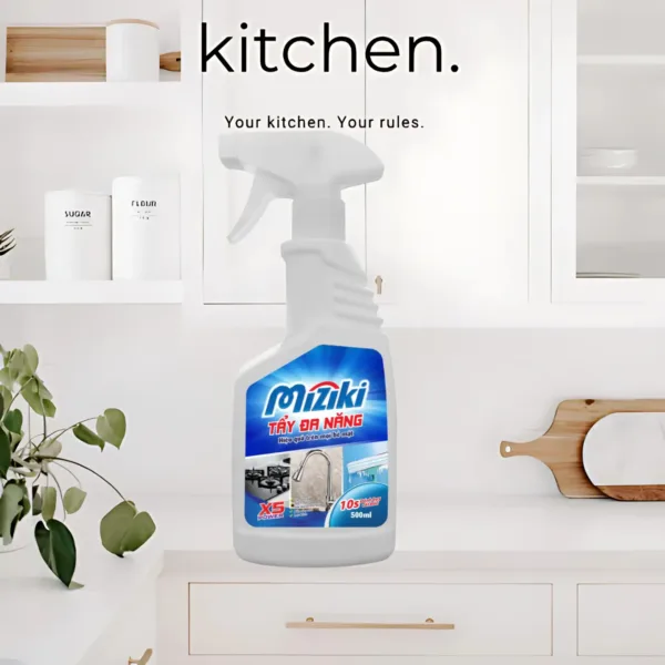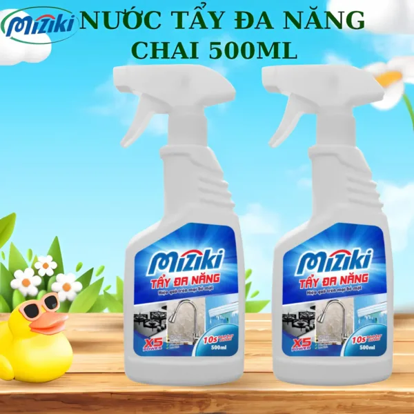 Chai Tẩy Đa Năng MIZIKI 500ml là giải pháp làm sạch nhanh chóng và hiệu quả cho nhiều bề mặt trong gia đình. Sản phẩm giúp đánh bay các vết bẩn cứng đầu như ố vàng, dầu mỡ, rêu mốc… trên kính, sàn gạch, bồn tắm, chậu rửa, vòi inox và nhiều vật dụng khác. Với công thức đậm đặc, MIZIKI không chỉ loại bỏ vết bẩn mà còn giúp bề mặt sáng bóng và vệ sinh hơn.